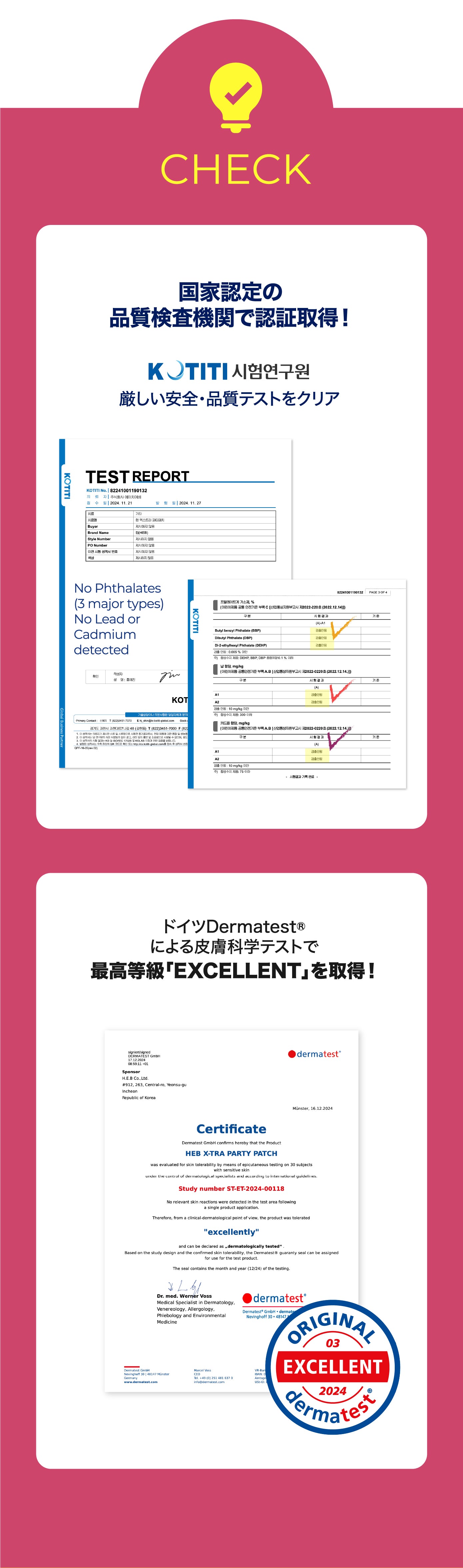 HEB PATCHは、韓国内で唯一の特許を取得した経皮パッチであり、皮膚刺激テスト機関で『エクセレント』評価を取得した、肌に優しい製品です。